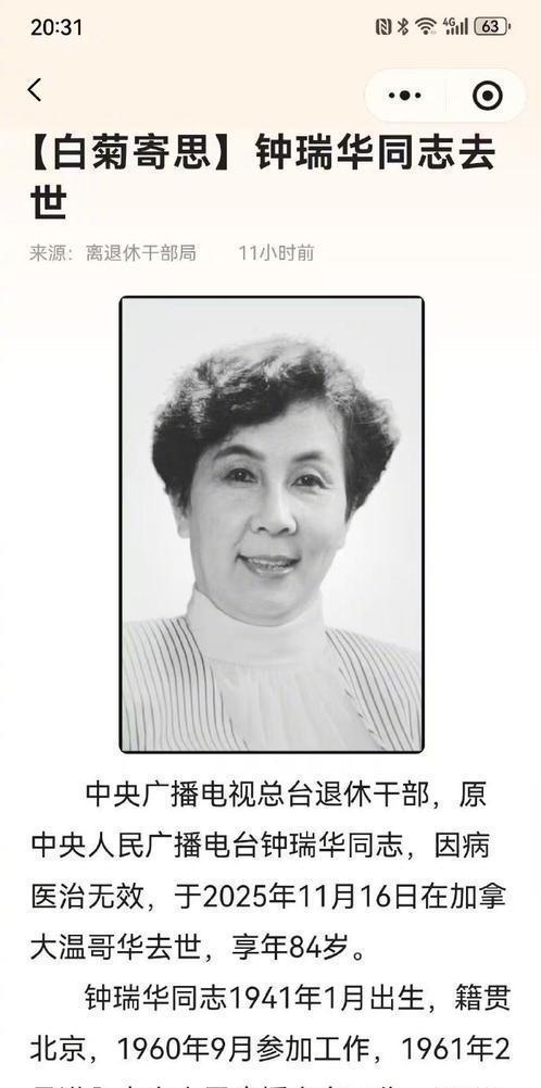 最近网上可是议论纷纷,不是哪个明星又出轨了,也不是什么流量小鲜肉耍大牌,而是关于一位老艺术家、一位我们父辈、祖辈都耳熟能详的名字。       11�日,钟瑞老师在加拿大温哥华因病离世,享�岁。这消息,是央视广播电台的退休人员账号发出来的。       您想想,平时账号发个什么通知,估计也没多少人关注,但这次不一样,因为主角是钟瑞!       对�后、60后甚�后的人来说,“钟瑞”这两个字,那可不只是一个名字,而是一段集体记忆。       她是中央人民广播电台《新闻和报纸摘要》的首席播音员,三十年来,她的声音陪伴了无数人开启一天,也结束一天。       她的声音,庄重、大气、字正腔圆,每一个字都带着力量,也带着一种时代赋予的独特印记。所以,这则讣告一出,自然引起了广泛关注。       然而,关注的焦点,很快就跑偏了。       大家都在问,也都挺好奇的:一个为国家广播事业奉献了一辈子的人,怎么就到在了异国他乡?是不是在国内赚钱,到国外花了?       为什么不回国养老,不落叶归根?这些疑问,直指钟瑞老师的晚年生活。可要我说,这里面,误会可大了去了。       其实,钟瑞老师和她的丈夫,那位我们都熟悉的体育解说大师宋世雄老师,一直都是中国国籍。       他们退休后,也一直定居在北京,过着寻常的退休生活。他们这次去加拿大,根本不是什么移民或者移居,而是去探望他们的女儿宋晓梅。       宋晓梅定居在加拿大温哥华。钟瑞老师身体一直不太好,老两口就想着趁着身体还行,去加拿大跟女儿团聚一段时间。       本来是高高兴兴的探亲之旅,没想到,半路上钟瑞老师的旧病复发了,最终没能挺过来,在异国他乡离开了人世。谁曾想一次探亲,竟成了永别。       说到钟瑞老师,就不能不提她的职业生涯。那可真是兢兢业业,一丝不苟,用现在的话说,就是业务能力杠杠的。       对于那些经历过那个时代的人来说,钟瑞老师的声音,就代表着权威和信赖。在话筒前,她一坐就是三十年。       广播播音员,那可不是随便念念稿子就行了,尤其像《新闻和报纸摘要》这种级别的节目,每一个字,每一个音,都不能错。       更厉害的是什么?�年�年,整整二十年!全国重要会议的文件宣读工作,都是由她来承担。       那些文件,冗长复杂,里面包含着各种人名、地名、数据。稍有不慎,就可能造成播出事故。       可钟瑞老师愣是做到了零差错播报!这份专业度,在播音界简直是神一样的存在,可以说是播音员的最高境界了。       这份专业背后,是她对工作的热爱和责任感。她不光是在念稿子,她是在用生命去传递信息,去讲述国家的发展,去连接千家万户。       她的声音,就是那个时代的见证,是无数中国人共同的记忆。       钟瑞老师能走上播音这条路,其实也是一个意外。她出身于一个书香门第,父亲是口腔科专家。       按理说,她要不就是继承父业,当个医生;要不就是追逐儿时的导演梦。可命运偏偏给她开了一个玩笑。       上世纪五十年代,北京广播学院,也就是现在的中国传媒大学,第一次从高中生里选拔播音员。       钟瑞就因为一次读报朗诵,被老师看中了,稀里糊涂地就成了播音系的第一批学生。       家里人一开始是反对的,毕竟广播这行当时还是新鲜事物,风险也大。可钟瑞老师当时依旧毅然决然地投身到了广播事业中。       这一投身,就是一辈子。她在学校里,师从夏青、齐越这些播音界的泰斗级人物,打下了扎实的基本功。1960年,她正式进入中央人民广播电台,从此,她的声音便响彻神州大地。       在央视广播电台,钟瑞老师不光成就了事业,还收获了爱情,遇到了她的终身伴侣宋世雄老师。       两位都是上世纪六十年代进入央广的新人。宋世雄当时是体育记者,写稿子有时候普通话不太标准。钟瑞老师就成了他的普通话老师,帮他纠正发音,教他绕口令。       一来二去,这感情不就培养起来了吗?       宋世雄老师后来回忆说,第一次见到钟瑞,就被她那文静的气质吸引了。于是,他就展开了朴素又真诚的追求:在图书室里递纸条,约她去食堂吃饭。       这可比现在那些花里胡哨的追求方式浪漫多了。最终,这份朴素的爱情,开花结果。       1965年,两人结为夫妻。婚后,他们挤在单位分配񊄱平米小屋里,日子虽然清贫,但有爱就够了。       他们互相谦让,凡事商量,钟瑞老师还亲昵地称宋世雄老师为“老兔”,说永远听不够丈夫的声音”。       最让人感动的是什么?是在宋世雄老师人生低谷的时候。上世纪七十年代中期,宋世雄因为一些琐事,被工作停了,精神几近崩溃。       钟瑞老师没有抱怨,没有放弃,而是用她看似柔弱的肩膀,撑起了整个家。她四处奔走为丈夫申诉,即便受到威胁,也把委屈藏在心里。       看到丈夫饭吃不下,她从微薄的生活费里省下五块钱,买了一份当时算是奢侈品的宫保鸡丁,红着眼眶对丈夫说:他的身体要是垮了,这个家就完了。       这份温暖和坚定,成了宋世雄老师最强大的精神支柱。       后来,在贵人的帮助下,宋世雄老师重返解说台,调入央视,成为家喻户晓的体育名嘴。而这一切,都离不开钟瑞老师在背后默默的支持。       除了互相扶持,他们还有一个共